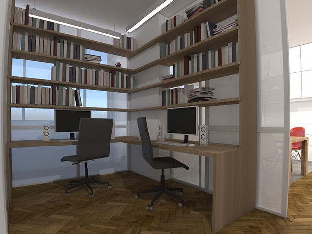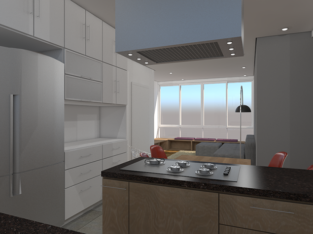 PROJETO 717.1043 Reforma de um apartamento para um jovem casal, no bairro de Perdizes, em São Paulo, incluiu a criação de um espaço para home-office. Para tornar o escritório mais agradável, as paredes foram substituídas por divisórias de vidro, incorporadas no mobiliário. A cozinha foi integrada à sala e foi criado um mobiliário especial para o apartamento.