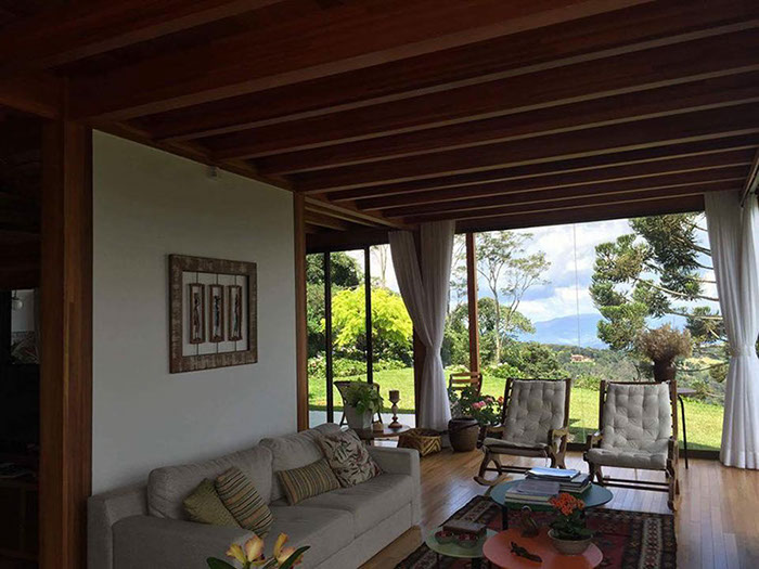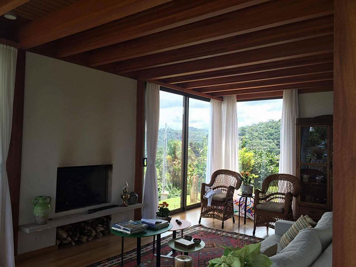 PROJETO 235-16 Projeto de ampliação de casa de campo a partir de construção original em madeira, com extensão também em madeira. O projeto 235 incluía a criação de mais duas suítes e melhoria das áreas sociais. A sala ganhou 3 ambientes diferentes, uma área de lareira com vista privilegiada das montanhas de Campos do Jordão, uma sala de TV e uma área de jogos, além da sala de jantar. O andar superior se integra ao térreo pela sua circulação aberta para o pequeno vão criado para melhorar a iluminação da sala de jantar.