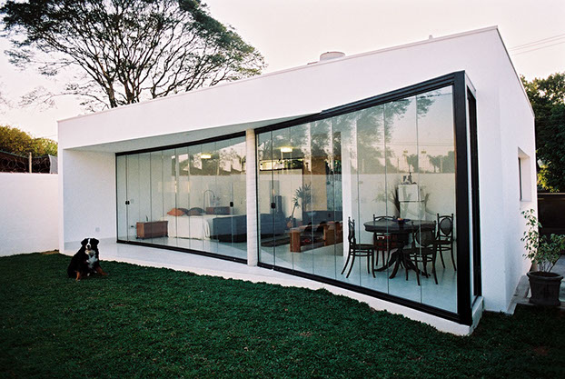 PROJETO 370 A Residência Artur Mausbach foi projetada em 2006 para ser a casa e o escritório do arquiteto, e para crescer com o tempo. O programa foi determinado pelas necessidades do usuário em cada fase da sua vida, sem desperdícios. Durante a primeira fase, de 2007 a 2012, a casa possuía apenas dois pavimentos que separavam funcionalmente o escritório da residência. Já em 2007, a casa foi selecionada para a Bienal Internacional de Arquitetura de São Paulo. O escritório possui entrada independente situando-se no pavimento semienterrado, solução que se adapta ao relevo do terreno e também propicia uma agradável relação entre as janelas do escritório e o jardim da frente, criando um inspirador ambiente de trabalho. Uma referência nostálgica ao espaço original do LAME da FAU USP. O escritório tem visuais apenas para frente preservando a privacidade do jardim do fundo da casa. No piso semienterrado também se localizam a garagem, a área de serviço e depósito. O pavimento térreo pousa sobre uma viga metálica destacando o volume cúbico do terreno e imprimindo leveza a arquitetura. O layout planejado incialmente para a casa, era aberto e flexível caracterizados por ambientes amplos e integrados. Apenas uma parede definia a divisão entre sala, banheiro e cozinha. O dormitório é integrado ao espaço da sala e todo o térreo tem vista para o jardim do fundo por uma grande porta de vidro em curva. Na segunda fase da casa, novos quartos foram construídos no andar superior, e a área social ampliada. Foi adicionada uma nova escada em madeira, com solução semelhante a aquela já usada no Projeto 77. O andar superior se caracteriza pelo conforto da madeira. Foi também criado um acesso ao terraço jardim e Spa. A obra da segunda fase ocorreu sem que a residência e o escritório precisassem ser desocupados. Para isso a construção em tecnologias limpas, estrutura metálica e steel deck, foram essenciais. A ampliação ocorreu em tempo recorde de 6 meses de obra. A casa conta com solução de redução de impacto ambienta e sustentabilidade, como reuso de água, ventilação cruzada, aquecimento solar, ponto de carregamento para carro elétrico, espaços compactos e grande área de jardim.