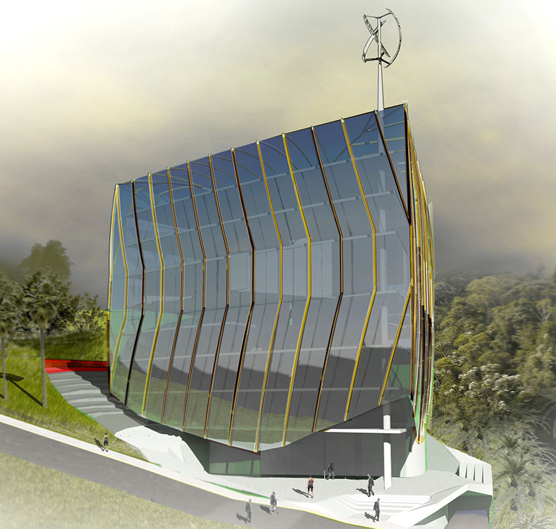 PROJETO FATMA/FAPESP Este projeto apresenta resposta arquitetônica e urbanística para a futura sede das duas importantes entidades do Estado de Santa Catarina, a FATMA e a FAPESC num terreno privilegiado por suas vistas esplendidas sobre o oceano e o continente, com uma topografia acentuada, inclinada em sua direção. A proposta adota como partido a idéia de um volume único, um edifício compacto, que se destaca do declive ao ocupar a parte baixa do terreno. O edifício é acessado através de uma passarela que o conecta com a parte alta do terreno, o início de um sistema de circulação coberta que atinge uma área intermediária entre as duas instituições presentes no edifício (FAPESC na parte superior e FATMA na inferior) e também interliga com os diversos edifícios que compõem o parque tecnológico, feito uma árvore frutífera que alimenta e é alimentada. O edifício consta de seis pavimentos e um mezanino. Considerando-se de baixo para cima, há quatro secções verticais. Na primeira, no piso inferior consta o acesso de funcionários e instalações de suporte. A segunda secção do edifício envolve os três pavimentos e mezanino utilizados pela FATMA. A terceira, com apenas um andar, abriga as áreas de uso compartilhado das duas instituições, bem como os auditórios. Neste nível ocorre interligação por passarela que dá a articulação urbana que cria o contexto de conjunto do Parque Tecnológica Alfa que deve caracterizar o campus, que se denomina “Árvore da Tecnologia”. A quarta secção consta de dois andares de escritórios da FAPESC. A articulação estrutural do edifício é feita por um núcleo de infraestrutura e circulação vertical, bastante heterodoxo e inovador, que permite a multiplicidade e versatilidade de arranjos espaciais, tornando as áreas de trabalho mais dinâmicas. Isto é viabilizada pela separação das prumadas de elevadores e a inversão da lógica tradicional. Abriga um vazio que se inicia no átrio, que além das suas funções térmicas e luminotécnicas, permite a integração visual e social dos diversos pavimentos.