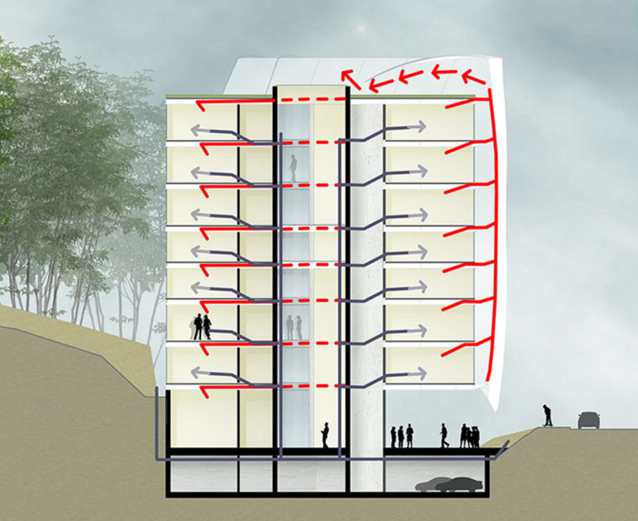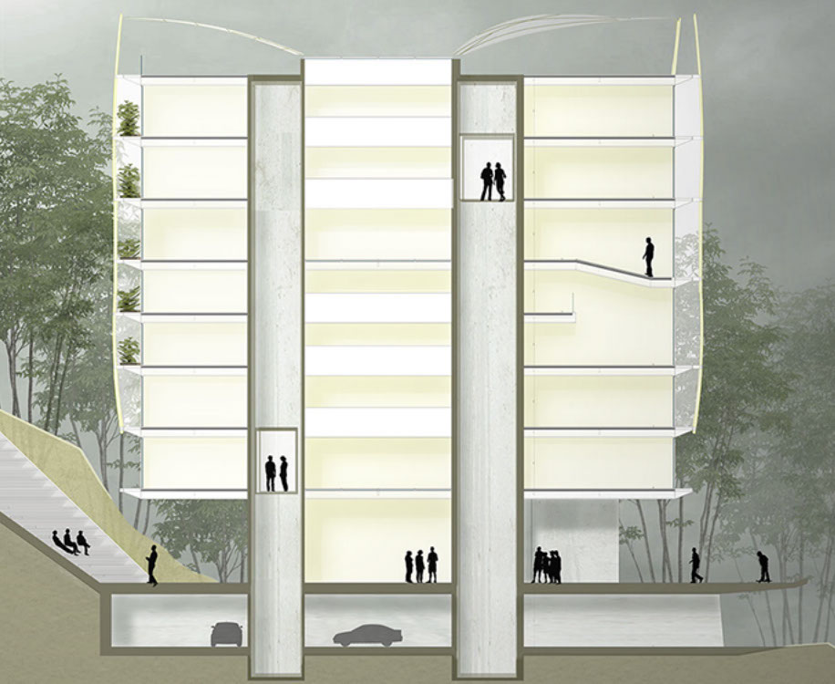 PROJETO FATMA/FAPESP Este projeto apresenta resposta arquitetônica e urbanística para a futura sede das duas importantes entidades do Estado de Santa Catarina, a FATMA e a FAPESC num terreno privilegiado por suas vistas esplendidas sobre o oceano e o continente, com uma topografia acentuada, inclinada em sua direção. A proposta adota como partido a idéia de um volume único, um edifício compacto, que se destaca do declive ao ocupar a parte baixa do terreno. O edifício é acessado através de uma passarela que o conecta com a parte alta do terreno, o início de um sistema de circulação coberta que atinge uma área intermediária entre as duas instituições presentes no edifício (FAPESC na parte superior e FATMA na inferior) e também interliga com os diversos edifícios que compõem o parque tecnológico, feito uma árvore frutífera que alimenta e é alimentada. O edifício consta de seis pavimentos e um mezanino. Considerando-se de baixo para cima, há quatro secções verticais. Na primeira, no piso inferior consta o acesso de funcionários e instalações de suporte. A segunda secção do edifício envolve os três pavimentos e mezanino utilizados pela FATMA. A terceira, com apenas um andar, abriga as áreas de uso compartilhado das duas instituições, bem como os auditórios. Neste nível ocorre interligação por passarela que dá a articulação urbana que cria o contexto de conjunto do Parque Tecnológica Alfa que deve caracterizar o campus, que se denomina “Árvore da Tecnologia”. A quarta secção consta de dois andares de escritórios da FAPESC. A articulação estrutural do edifício é feita por um núcleo de infraestrutura e circulação vertical, bastante heterodoxo e inovador, que permite a multiplicidade e versatilidade de arranjos espaciais, tornando as áreas de trabalho mais dinâmicas. Isto é viabilizada pela separação das prumadas de elevadores e a inversão da lógica tradicional. Abriga um vazio que se inicia no átrio, que além das suas funções térmicas e luminotécnicas, permite a integração visual e social dos diversos pavimentos.