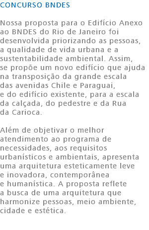 CONCURSO BNDES Nossa proposta para o Edifício Anexo ao BNDES do Rio de Janeiro foi desenvolvida priorizando as pessoas, a qualidade de vida urbana e a sustentabilidade ambiental. Assim, se propõe um novo edifício que ajuda na transposição da grande escala das avenidas Chile e Paraguai, e do edifício existente, para a escala da calçada, do pedestre e da Rua da Carioca. Além de objetivar o melhor atendimento ao programa de necessidades, aos requisitos urbanísticos e ambientais, apresenta uma arquitetura esteticamente leve e inovadora, contemporânea e humanística. A proposta reflete a busca de uma arquitetura que harmonize pessoas, meio ambiente, cidade e estética.