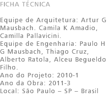 FICHA TÉCNICA Equipe de Arquitetura: Artur G Mausbach. Camila K Amadio, Camilla Pallavicini. Equipe de Engenharia: Paulo H G Mausbach, Thiago Cruz, Alberto Ratola, Alceu Begueldo Filho. Ano do Projeto: 2010-1 Ano da Obra: 2011-3 Local: São Paulo – SP – Brasil